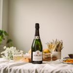 The Blanc de Blancs is white gold in color, with a delicate nose of white fruit, rose, and hazelnut. On the palate tangerine, green melon, and pear.